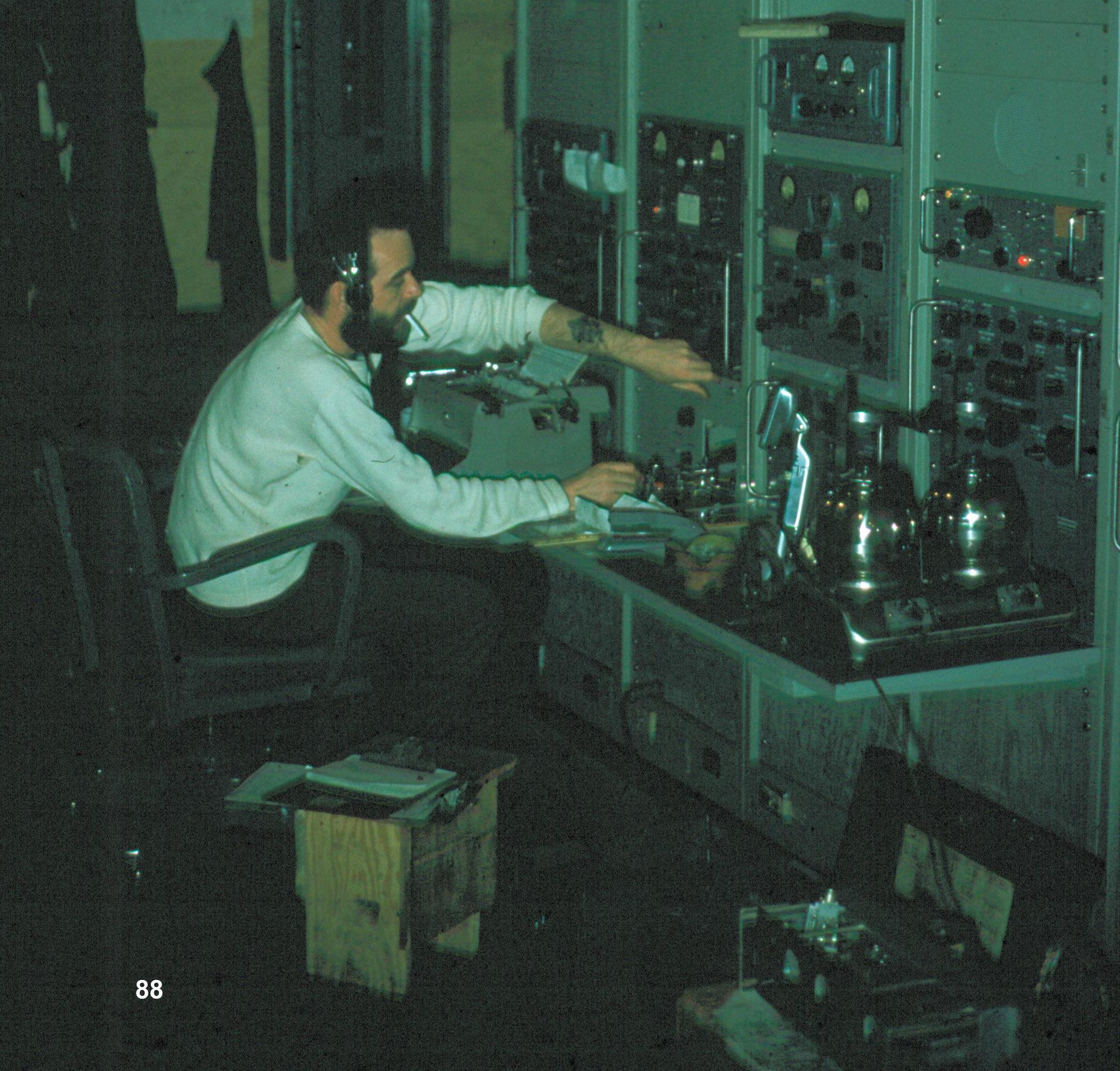RMC (Radioman Chief) Joe Cornely, one of two Navy radiomen, maintaining communications.