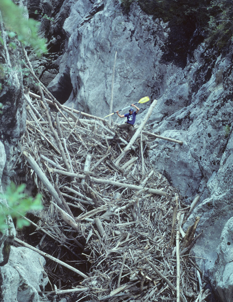 “The walls are smooth and vertical, sometimes overhanging. The water is slow at the beginning and it’s strangely inviting. You can almost hear the Sirens inviting you in. It might be tempting to paddle a short distance––just a short distance––to see what it’s like. But if you did, it would be a black widow’s embrace. You would be there for the duration––however short or long that might be. Once in the gorge there would be no way to climb out from river level. And what might you encounter? Walls closing in. The river beginning to hurtle downward. Then the black widow herself: a mass of logs forming a narrow spiny plug extending 30 feet or more above the surface of the river.”