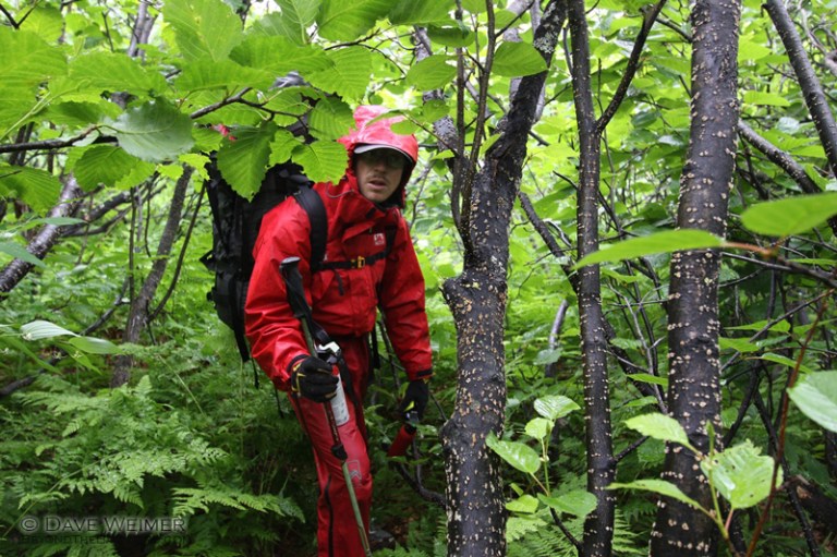 Thankfully, the bear trails were magnificent; in fact, I’d call them bear highways. Bear tracks and scat led the way. Occasionally we’d see territorial markings where a bear had torn off all the limbs and bark from a tree and then rubbed his back against the oozing sap, leaving a thick coating of hair permanently embedded in the tree. I pulled some hair off the sap and gave it a smell. I expected the stink of a dirty animal but was rather surprised by a pleasant leathery smell, that of an old shoe store.
