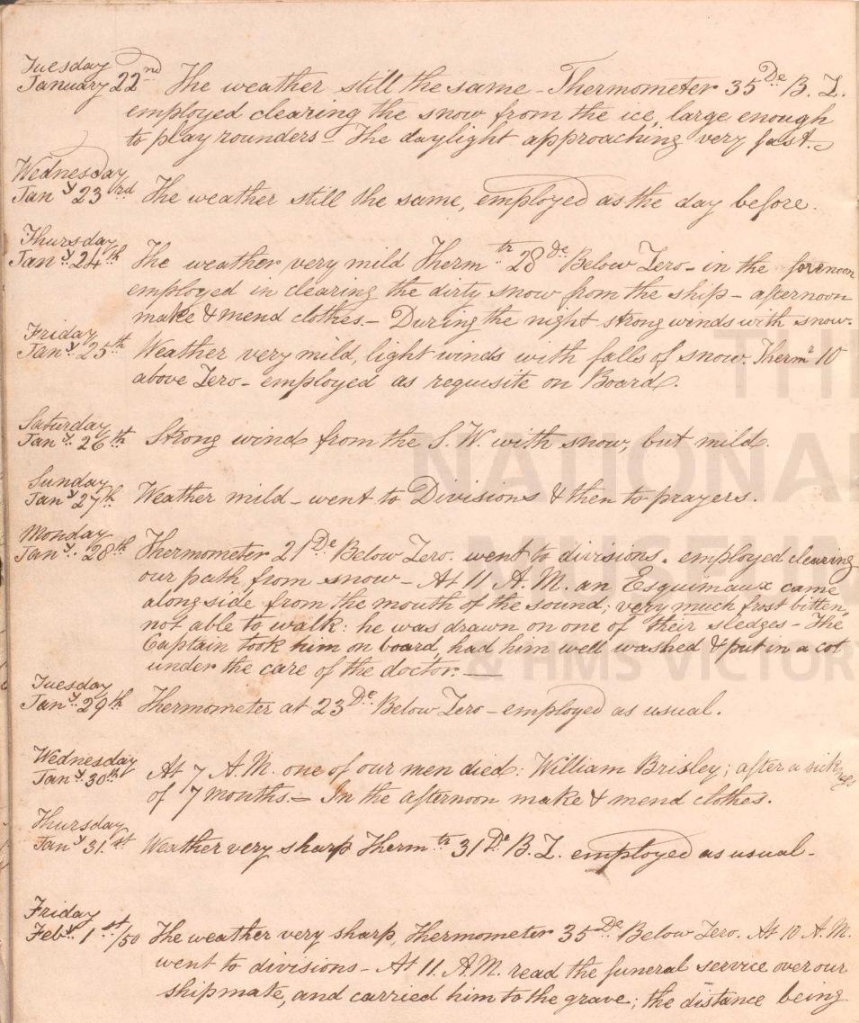 Almost every evening, if the weather was decent, they cleared the snow off the sea-ice and played ‘rounders’- which was an early form of baseball.